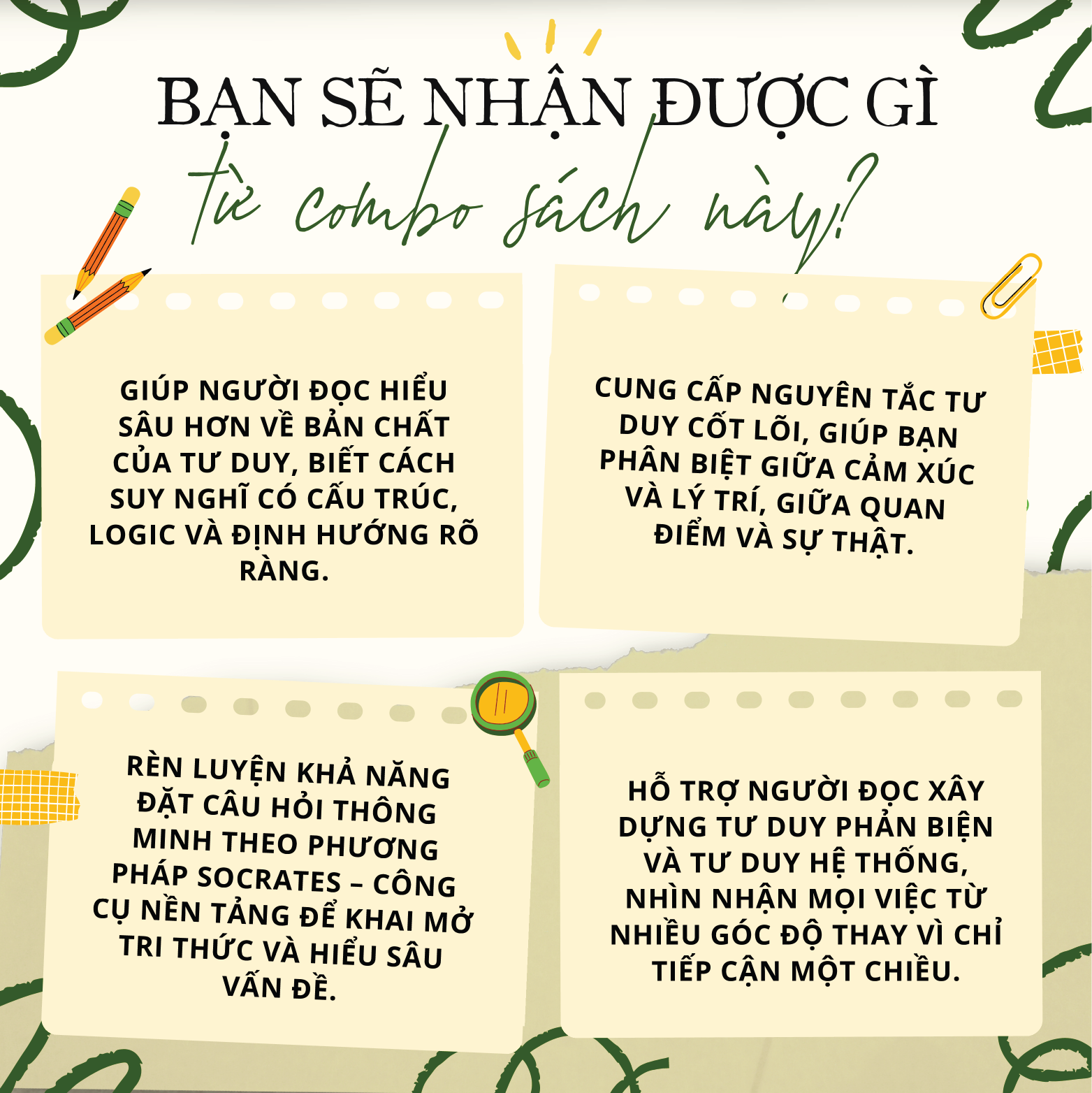 Là kim chỉ nam giúp bạn suy nghĩ rõ ràng – ra quyết định đúng đắn – hành động hiệu quả, từ đó phát triển toàn diện cả trong học tập lẫn công việc. Bộ sách giúp bạn không chỉ học cách tư duy mà còn áp dụng tư duy vào thực tế để đạt được kết quả tốt hơn.